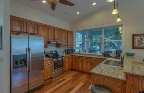 Floor Plan: Ground Floor - Outside - open parking area, outdoor shower, lagoon dock with fish cleaning station, covered seating, and kayak/paddle board launch. Inside - Great-room with living area, TV, DVD, sleeper sofa, kitchen, eat-in bar, dining, and access to the screen porch. Screen Porch - dining, seating, fans, lagoon view; Bedroom 1 - queen bed, TV, private full bath with tub/shower Jacuzzi; Bedroom 2 - queen bed, TV; Bath 2 - full bath with walk-in shower (handicap friendly).