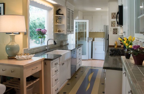The open and airy design includes a large office, family room, two generous sized bedrooms, master bath and central hall bath with original tile. In the office an expansive desk looks out on the front garden, and is complete with wireless printer/scanner, a large comfortable couch and a CD/stereo. The family room has the fireplace, smart TV with DVD player, an oversized comfy sleeper couch for additional guests, and dining area with four high seats for a view of the garden. Glass doors open onto the outdoor sitting area and secluded pool. Both bedrooms have large closets and queen size beds complete with high quality linens, pillows and comforters. The master bedroom has a mirrored dressing room, glass doors opening onto a patio and path to the pool, and marble vanity in the master bath. Both bathrooms have generous tubs and a shower. The fully equipped kitchen has granite counters, a farmers sink and door leading to the outdoor gas barbecue. Hardwood and bamboo floors run throughout the entire home.