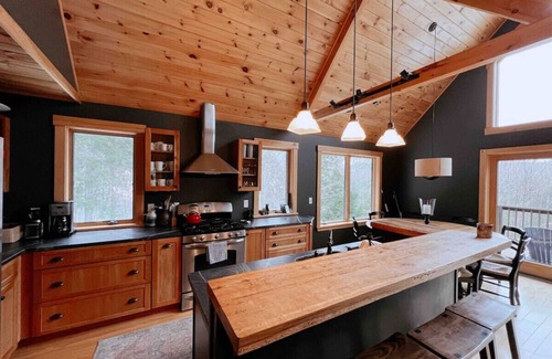 This log-sided, custom-built designer home is located in one of Bethel's prettiest areas, surrounded by acres of lush green pine trees and mountains. 12 minutes from Sunday River Ski Resort and 5 minutes to the town of Bethel. With three floors of living space, this home is fully private and makes for the best getaway.