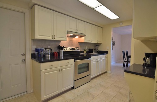 The kitchen comes completely stocked with all your culinary needs. Just a few of the amenities include stainless steel electric range and double-door refrigerator with ice machine, microwave, Keurig coffee machine, toaster oven, blender, electric kettle, Brita water filter, and a complete set of cookware, tableware, and glassware.