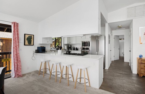 What we love about this property is the convenient location, extra large deck with pine tree views and hot tub, and modern and minimalist finishes throughout the home.