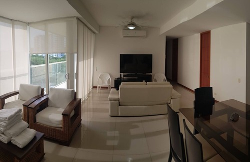 Luxury Apartment located in Bello Horizonte, Santa Marta. Three bedroom apartment (1500 sq ft (137 sq mt)) with large living room, dining room and TV room, three bathrooms, spacious kitchen and large balcony. The apartment has a horizon view where you can detail the ocean and see the sunset every day. The building complex has three pools, 3 jacuzzi, sauna, gym, it has a private entrance and exit for the shopping mall, free parking. The apartment has Free Private Wifi, two TV's and the whole place for you and/or your group
