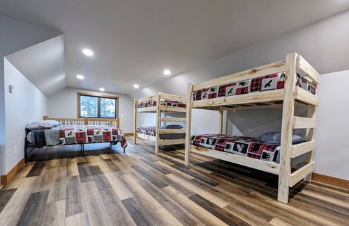 This west facing cabin catches lots of morning and evening sun and showcases some gorgeous sunrises and sunsets. The main floor has the main entry, great room, chefs kitchen, dining room, sun room, laundry, kids bath, walk in storage closet, bunk room, loft, half bath, library and master suite. The lower floor has the game room, family room, guest suite and 4 bedrooms with two additional full bathrooms. Each bedroom has a king bed with a trundle. Giant windows in each room showcase the woods and lake. In floor and forced air heating along with two gas fireplaces make our cabin super cozy. Quiet is the word for this place, it's refreshing, relaxing and restoring to be here.