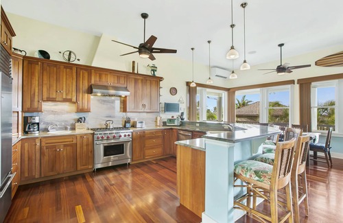 Ho'ohu Nani has Four Bedrooms (2 Master Suites), Den with Fold-Out Couch, Four Full Bathrooms, and Two Half Baths. Ocean Views from Upstairs Living Area and Covered Lanai. The Kitchen includes top-of-the line appliances with a new Wolf Range, beautiful granite counter tops + bar counter, and Large Dinning Table. Kitchen is equipped with the all culinary tools necessary. Every Bedroom has sliding doors that lead outside to patios and/or decks allowing for easy indoor and outdoor access. The property has a huge 40ft Lagoon Style Solar heated pool with jacuzzi surrounded by lounges and tropical landscaping. Enjoy Ocean and Sunset Views. Membership to Poipu Beach Athletic Club included.