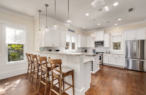 A lovely front porch with a deep porch swing, Adirondack seating, and overhead fans welcomes guests upon arrival. Step inside the 2-level home to find rich hardwood floors and white wainscotting elegantly adorning the first-level great room. A soft, slip-covered sectional and 2 armchairs make up the living area—perfect for conversing with the group or hosting movie nights on the wall-mounted TV. The space flows effortlessly into the vast kitchen, featuring high-end appliances and a 4-stool breakfast bar for casual meals or quick bites. Adjacent is the dining room with an 8-person formal table for group dinners. Head outside, where a spacious deck with an alfresco table and overhead fan offers a prime spot to enjoy meals in the coastal breeze. A few steps down is the glistening private pool and spa, surrounded by loungers, chairs, and thriving greenery for ultimate privacy. At the end of the day, retire to the bright guest bedroom with a king bed and private bathroom. Feel free to pack light thanks to the washer and dryer.