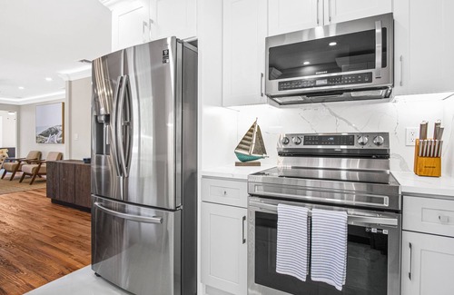 Kitchen. Luxurious waterfall countertops and new appliances. Fully stocked with all essentials for cooking and cleaning. You will find everything you need and more! Direct access to back deck, patio, and pool area.