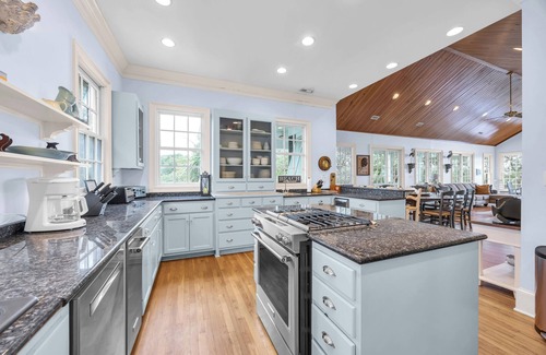 Step inside to find an expansive open floor plan featuring designer furnishings and a coastal-chic aesthetic straight out of Coastal Living. The fully stocked gourmet kitchen includes a wine cooler, wet bar, and double refrigerators, and opens seamlessly into multiple dining spaces with seating for up to 18 guests. After dinner, unwind in one of two comfortable living rooms or gather on the oversized porches to take in the evening breeze.