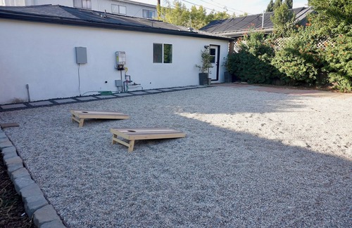 See LA with family or do a couples' vacation at this stylish new build 2 bed 2 bath house with full kitchen, private entrance & parking. Swim or jacuzzi in solar heated salt water private pool. Free tv streaming, board games and 40 foot long cornhole throw. See Universal Studios, Walk of Fame, Magic Castle & other LA attractions! Metro station and Barone's Italian Restaurant are a 2 minute walk. Host is LA local & happy to provide recs, I love helping plan your dream trip!