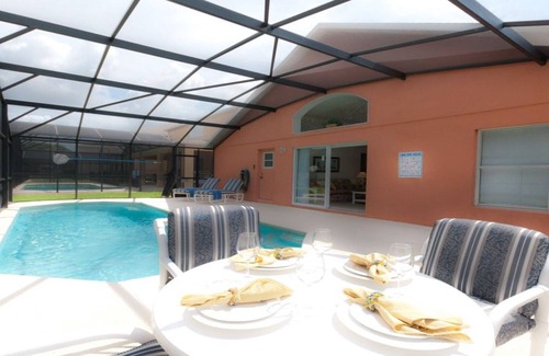 Very fresh pool villa in the Seasons community. Located ideally for a vacation in the Disney area. Equipped to high standard for your comfort! Living room with comfy sofas, BBQ free of use, stroller and kids car seats (3) available. 10 min to Disney World and 15 min to Universal and SeaWorld. The villa is fully air-conditioned and is a great base due to it's location and the good facilities. Private pool that can be heated. Free Wi-Fi. Free Phone calls within the USA. Xbox 360 kinect. Fully equipped kitchen with high chairs and cots provided at no extra charge. Two bedrooms with en suite bathrooms - one with king size bed and the other with queen size - ideal for two families sharing the villa. Bedroom three and four has two twin beds in each room and shares bathroom three. Three TV sets (largest 46') with cabletv. Blu-ray (Dvd) player. For child safety a pool fence and alarmed doors is available. Walmart 2 min away.