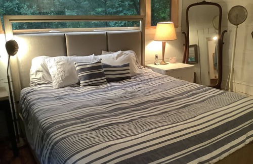 The living room adjoins the kitchen and features an open design with high ceilings. It is heated by a wood stove fitted into the fireplace. There is plenty of room for reading or enjoying the company of your friends and family. A set of double doors leads from the living area to a large deck that overlooks a green forest, Panther Branch Waterfall and beyond to the Little East Fork River. This is a large property with over 6 acres located between Panther Branch and the Little East Fork River. There is a footbridge that spans the Little east fork with a rough path (at your own risk) that rises to a lookout in a pavilion that looks over the property on fall days (not in summer-it's a forest of green then)
