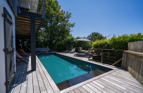 Located in a residential area on the heights of Pyla, Villa Anaïs will charm you with its surprising personality and obvious functionality. It will seduce you with its living space open to the horizon, its 7 bedrooms equipped with a shower room, its pool anchored in a wooden terrace and its intimate garden