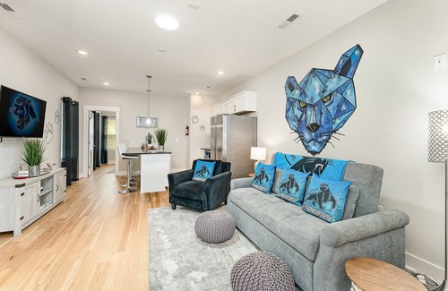 This one-of-a-kind luxury duplex is among the most unique properties located in Uptown Charlotte, comfortably accommodating 20+ guests within a 10-minute walk to Bank of America Stadium, Charlotte FC matches, Spectrum Center concerts, and Uptown restaurants and nightlife. Perfect for large families, friend groups, or company retreats, this fully private 6-bedroom, 6-bathroom duplex is loaded with custom murals, game-night extras, upscale finishes, and social media-worthy design touches inspired by Charlotte’s iconic pro sports teams—the Panthers and Hornets.