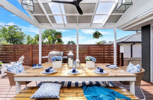 ♔ A Hamptons-inspired alfresco undercover deck area with 4-burner BBQ and fully-fenced yard
