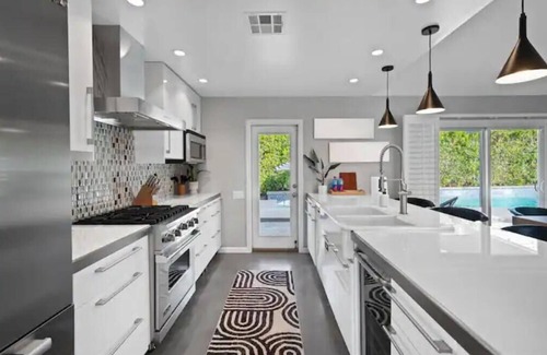 Experience the captivating, modern desert vibe and meticulously designed interior of 𝑀𝒾𝓁𝑒𝓈 𝒜𝓌𝒶𝓎. The open concept living and dining room is a true masterpiece, accentuated with raw wood and modern art. The stunning dining space comfortably accommodates eight guests, while the kitchen boasts stainless steel appliances, including a Viking range and large built-in refrigerator. You'll appreciate the well-appointed bedrooms, furnished with high-quality beds, pillows, and linens, and the contemporary bathrooms with stylish fixtures and attractive tiling throughout. Custom shutters on windows and doors let in natural light during the day and ensure privacy at night. With central air conditioning and high-speed internet, you'll feel right at home, even though you're 𝑀𝒾𝓁𝑒𝓈 𝒜𝓌𝒶𝓎 from yours.