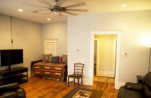 Rain Song Loft is ideally located in historic downtown Pawhuska, OK. Our guests enjoy spacious and comfortable accommodations including private entrance, 2 bedrooms, 1 bathroom with clawfoot tub, living room, dining room, kitchen, screened back porch, and private backyard with firepit. The loft is located on the 2nd floor of the historic FG Hill building constructed in 1912, and was fully renovated to include modern amenities while keeping many original features, such as high ceilings and wood floors. Our guests love the ideal location just steps from the Mercantile and other downtown shops. We can accommodate up to six guests. Perfect for ladies trips, couples, families with children, or business travelers.