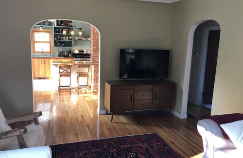 Main bedroom on 1st floor includes a queen-sized bed and vintage dresser and mirror. Upstairs loft bedroom has a queen-sized bed and the spaces doubles as an office, with desk and office chair. The loft has 4 large skylights (two of which open completely) with amazing views of Mount Jumbo and into the forest canopy of Greenough Park.