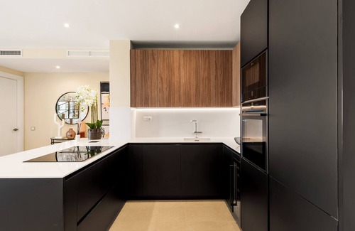 The front door opens to a fully equipped open plan kitchen, a dining area and living room, to the right, a corridor leads to the apartment’s 3 bedrooms. The elegant kitchen features a practical breakfast island, brand-new top-of-the-line appliances, finger-pull cabinetry and ample countertop space. The kitchen has all the appliances and utensils expected of a luxury rental property, perfect for those guests that enjoy cooking and entertaining from home. The kitchen looks over the dining area (seating for 6) and living room, which is beautifully furnished with reclined chairs and deep sofa facing a large smart TV (Netflix, Amazon Prime etc) hung on the wall above a fireplace.
