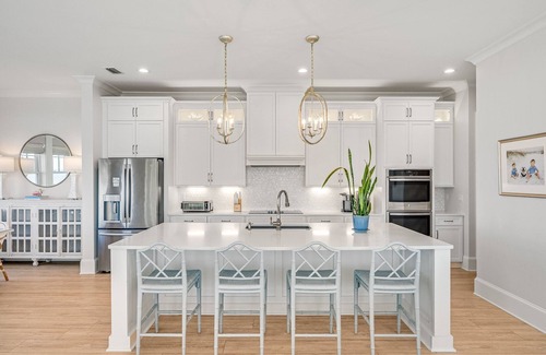 At Manly's Beach House, your private pool is located on the second floor deck just off the living/dining/entertaining area. The kitchen has everything you need with double ovens, an air fryer, large cooktop, large refrigerator, microwave, crock-pot, blender, Lenox dinnerware, and Green Pan cookware. Commercial grade Keurig coffee machine and coffee pot. The dining area is appointed with a large table overlooking the pool and Gulf, with additional seating at the island and on the deck. The wet bar includes a sink, wine cooler and dual refrigerator drawers for all your beach beverages. All dinnerware/cookware/glasses/silverware are provided in the home.