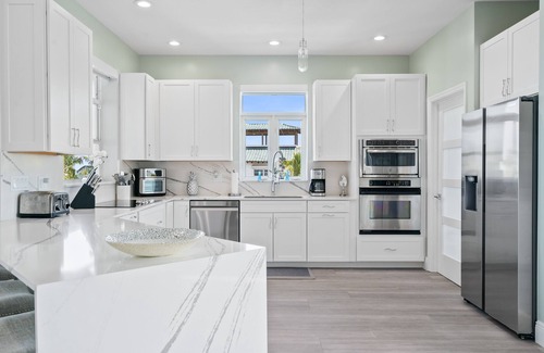Completely remodeled, high-end Summerland Key home! Meticulously designed vacation property with exquisite furnishings throughout the home, quartz countertops, and top-of-the-line stainless steel appliances. This newly remodeled home has a lovely open & entertaining feel to the living, dining, and large outdoor spaces! The home consists of four large bedrooms plus a separate office space. The master suite has two separate en suite full bathrooms and contains a king bed, a single-size pullout chair, and a queen pullout couch located in the office. The two other bedrooms each have king beds and the third bedroom has four separate full-size mattresses located on bunk beds. The living room has been furnished with a very inviting couch consisting of a queen, high-quality pillow top pullout mattress as well. Each coastal-designed bedroom also has its own flat screen tv as well as a large flat screen tv in the living room for family movie nights. The spacious outdoor area (including the covered space underneath the house as well as the large pool deck area) is sure to be perfect for your entertaining pleasure! Enjoy fishing right off the seawall or just grab a cocktail and sit under the Tiki hut with a great view! Bring your hammock to hang near the pool and enjoy the professionally landscaped tropical oasis yard or watch the Coconut Palms blow in the breeze! The pebble tech pool was thoughtfully designed with a perfectly angled shallow sunning deck which has bubblers and an umbrella to relax under as well as two water features at each corner. We have cornhole and ledge loungers for your use with your guests located in the garage. This allows you to lay back and relax as you watch your guests play and boats travel by across the open water view! The canal is deep water and nice and wide so bring your large boat to take pleasure in. The property has over 100 feet of docking seawall for your boat/s! Enjoy a lobster dinner with your guests on the main balcony at the back of the house which has enough seating for six or eat inside at the dining table which also seats six and the peninsula off the kitchen which seats three. All water-view windows and sliders have remote-controlled shades so you can lay in bed and just push a button to watch the golden sunrise in the morning as you wake! Just a 10-minute short boat ride straight out of the canal to the famous LOOE Key national reef and amazing snorkeling! Hop in the car for only a 30 minute ride either way to Marathon or Key West so you can enjoy the wonderful restaurants and nightlife as you choose! Don't miss out on making lifelong memories with your family or friends vacationing at this exquisite Florida Keys home!