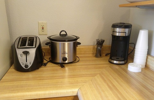 The spacious kitchen has everything to need to cook a meal like a boss. The kitchen in stocked with Emeril pots and pans, a Crock-pot, Keurig Machine, full sized fridge and a full sized stove/oven. Save some money dining in on delicious home cooked meals.