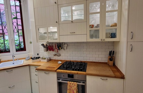 While you're here, you can enjoy all the comforts of home and more, including WiFi and a bidet, as well as air conditioning and an ironing board. Other amenities include laundry facilities, towels, soap, and toilet paper.