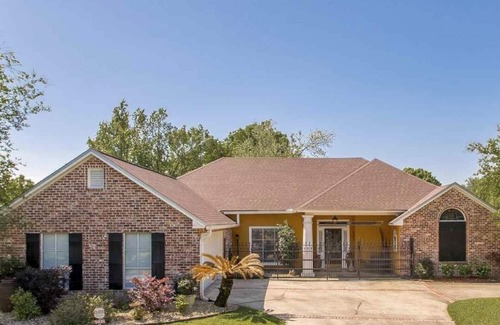 This house sits on a large, private, shaded lot in a quiet upscale community. It is close to shops, library, stores, hospital, movie theater, and parks. Newly remodeled and sparkling clean. Great for families. The backyard is an oasis to relax in with a 50 ft lap pool, shaded patio, outdoor shower, palm trees, swing set, and crab-shack style covered cook area with grill, smoker, sink and fridge and concrete countertops. Inside, there are several living areas to relax in, state of the art audio and video set up. Large kitchen with marble island, countertops, and bar seating. Jacuzzi spa in master bath. Bedrooms are spacious and comfortable with King (master), Queen (bedroom 2), Bunk Beds (bedroom 3). Room in rear of house has a pull out couch. 20 min ride to LSU.