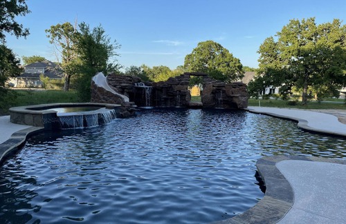 The backyard features a beautiful, oversized pool with waterfalls, grotto, jump rock and slide. The hot tub comfortably seats 10 adults. All guests swim at their own risk. There is no lifeguard available. Tanning ledges and loungers are available as well. Enjoy a game of washers or cornhole! ***Pool can be heated November-February for an additional $1500. Must be paid through customized booking request and ahead of stay.***