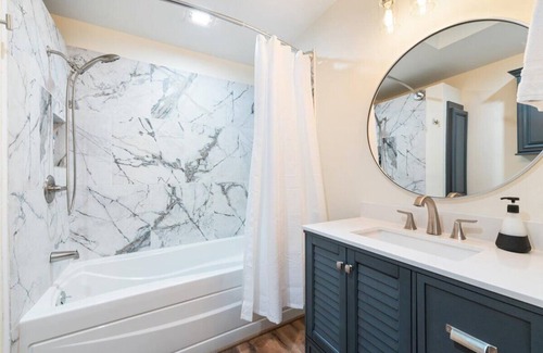 -The master suite has a memory foam king bed (so comfy!), ceiling fan, a large walk-in closet, wall mounted 42" smart TV, and large tub shower combo in the en-suite bathroom.