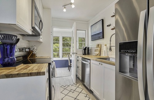 Retreat to one of the two stylishly decorated bedrooms, both featuring fresh linens and comfortable bedding for a peaceful night's sleep. The day bed in the 3-season sunroom provides extra sleeping space (twin or king) or a cozy spot to curl up and read. Wake up to the soothing sounds of the birds chirping and step outside to your own outdoor space, perfect for sipping your morning coffee surrounded by nature.