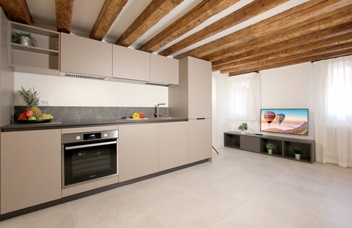 Residence composed of two distinct apartments (first floor) located in the Historic Center of Venice, 10 minutes walk from Rialto Bridge and 15 from St. Mark's Square. Both apartments have a living area with a complete kitchen, living room with sofa bed and dining table. The first apartment has three rooms (two double, one single) and two bathrooms, the second apartment has two rooms (one double and one single) and two bathrooms. High-level furnishings. Upon request 4 additional sleeping places (sofa bed). Maximum capacity 12 people. Check-in time: 3:00 PM to 8:00 PM. Arrivals between 8:00 PM and 11:00 PM may require a supplement of €50 (to be paid in cash upon arrival). (ID: IT027042B4CHPKI2AG, IT027042B4OTB4DS4R).