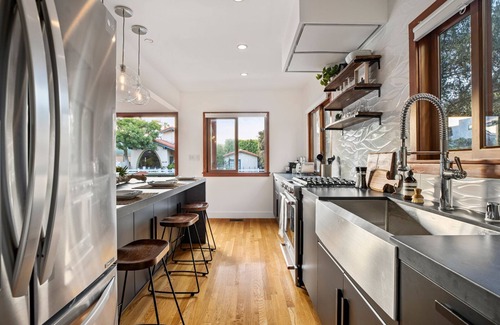 The house is complete with chefs kitchen- top of the line appliances including Kitchen Aid stove, Miele dishwasher, and LG refrigerator. Kitchen is equipped with everything you'll need for your stay. Cozy furnishing throughout. In-door/outdoor vibe with outdoor dinning area and fire-pit overlooking the canals. Private and detached office space separate from the main house.