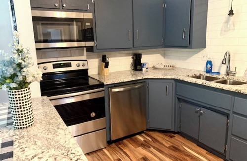 New dishwasher, over range microwave, large stainless steel fridge with ice maker, fully stocked kitchen, and new king sized bedroom set. This unit also embraces the culture and life of Green Bay with black and white custom canvases of the local area and state, and inspirational quotes from local legends.