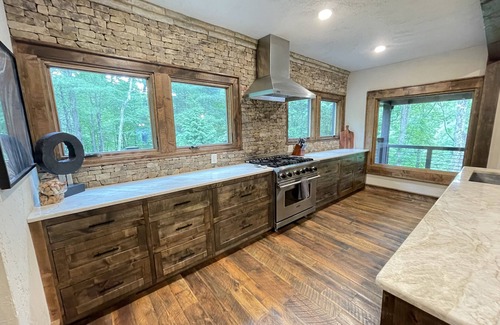 Centrally located between Blue Ridge and Ellijay, GA, River Joy Lodge sits on 6 acres of private forest and features 5,700 sq ft of luxurious living space including 5 total bedrooms and 4.5 baths, including 3 master suites, chef’s kitchens, hot tub, entertaining decks, and your own slice of mountain paradise. This estate is fully equipped and ready for 16 guests.