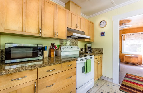 We have a newly remodeled kitchen with granite countertops stocked with all the necessities, including a dishwasher, coffee maker, microwave, blender, and toaster. There are some spices and spice blends to stir your creativity into making meals right in your own vacation home. In addition, there is a gas grill and a covered patio table for dining. There is also a fabulous rocking swing for two or three people to sit and watch the river go by!
