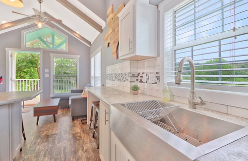 Arrive at an adorable robin's egg blue house that overlooks the Blanco River. Inside, find a delightful tiny house that offers all the conveniences of home. Sleep soundly in a private bedroom with a plush queen-sized bed with fun pops of color. The loft offers the perfect escape for the kids with a queen and twin bed. Kids will have found their secret escape in this space with the low ceilinged loft that is just their size! Preparing meals is no chore in this tiny river house! With a well equipped kitchenette to include a convection microwave oven, full refrigerator, stove, and all of the necessary conveniences to whip up a delicious meal. Choose to dine at the table for four located off the kitchen or the covered deck area on the front porch overlooking river views under the towering oak trees.