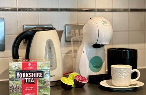 Hob, oven, microwave, toaster, kettle, Dolce Gusto coffee machine, sandwich toaster, dishwasher, washer/dryer.