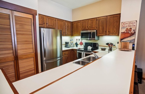 Inside your condo, enjoy a full kitchen and four tall stools at the breakfast bar. The living area has a sofa, comfy chair, TV and dining table for four. All surround the beautiful stone fireplace. The one-bedroom has a queen bed, second TV, large closet and for your other guests, two more can be comfortably situated on the living room sleeper sofa with memory foam.