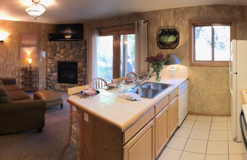 Imagine enjoying your morning coffee/evening glass of wine or the best: falling asleep to the sound of the Tonahutu River (Small River) directly behind this 1 bedroom condo - Riverfront Paradise #3. This Riverfront hideaway will make all of your worries drift away after a day of enjoying the area, enjoying unlimited hiking or exploring the 3 major lakes - you will enjoy coming home to just relax, by the warmth of the river rock fireplace or take advantage of the fully equipped kitchen and make a wonderful meal. At nights end, enjoy a movie night or favorite show on the flat screen TV before hitting the comfy King size bed (and Queen pull-out + a fold away twin bed) for a tranquil nights sleep. The LazyBoy Queen pull out couch with memory foam mattress is so comfy! We also have Riverfront Paradise #1 right next door – perfect for another couple. Stay cozy warm with in floor radiant heat. Zoom meeting? Online school? Our Wifi is fast - 200mbps!
