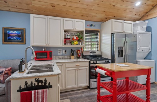 This camp features vaulted ceilings and modern upgrades, with two bedrooms and one bathroom. The larger bedroom includes a queen bed and a pullout queen sleeper sofa, while the smaller bedroom has a twin daybed and trundle that can convert to a king. Looking for additional sleeping options? There’s also a sleeper sofa in the living room.