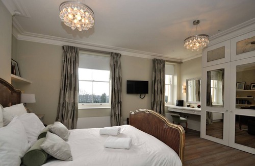 Being directly above the sitting room on the second floor, this beautiful and large bedroom also benefits from the incredible views of the Thames. There's a double bed, two bedside tables, a wall mounted flat-screen TV, huge fitted wardrobe and a dressing table.