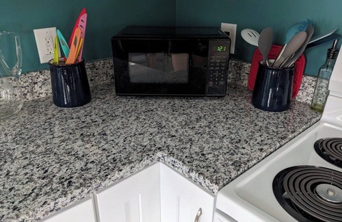 You’ll feel at peace the moment you walk through the door! The cool colors, comfortable furniture and little details will welcome you right into the great room. You can cozy up on the L-shaped sofa to read or stream your favorite show. The 4-person dining table doubles as a work space - the giant windows bring in plenty of natural light. The brand new kitchen includes all the amenities - large and small - that you need to make your favorite meal, or just to heat up leftovers from one of the Bull City’s award winning eateries.