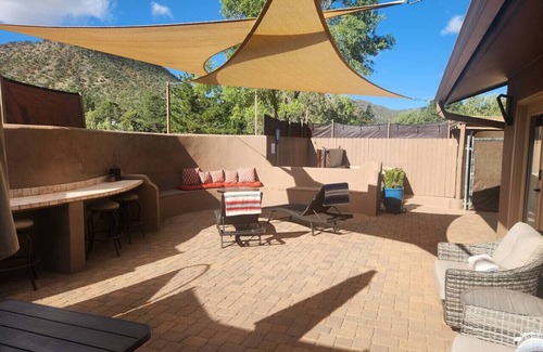 Enjoy this stylish cozy suite with a private hot tub and fire table. Spacious patio for your enjoyment. A wonderful place to start your day with coffee & fresh blue skies or stargazing in the evening after an amazing day exploring Red Rock magic! King size nectar bed, luxury linens, oversized chaise lounge for relaxation. Mini fridge and a microwave. DISH TV. Enjoy the rain shower head and the softest bath towels & robes! Convenient location!