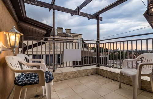 Central location on the Clocktower hill. 4th floor. Very spacious, sunny, airy air conditioned flat with windows to the south, east west and north. The flat accommodates 4, best for a family with 2 kids. A double bed in a niche, a living room with king size bed and 2 sofas and coffee table. Kitchenette with basic facilities has access to rooftop terrace with breathtaking view towards the Old Town. WC and shower. Special space for luggage.