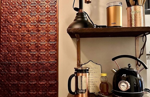 There are three apartments we rent out at 123 s Washington so if you are traveling with others and want to stay together, please also check out the listings for The Artist's Loft and The Peacock Loft. There are three patios that anyone can sit on and enjoy. Although we are off of Main Street, road noise is usually limited in the Copper Room but feel free to bring a fan or earplugs if very sensitive to noise - we want you to have a great sleep! This is a unique room and has exposed copper pipes (which is why it is decorated in a copper theme!) - please note that there may be small water-trickling sounds coming up the pipes (the room has 12 foot ceilings though so they are high-up) above. Do not be alarmed - this is normal. We just want you to be aware before booking so this doesn't upset you. Also, this apartment only has a small partial kitchen: Fridge, hot plate, air fryer microwave, sink, and cupboards. Plenty of room to store fresh/dry food for a weekened/week though.