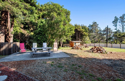 This beautifully decorated and self-contained, romantic, studio suite, located on 11 private, forested acres, is ideal for a peaceful sanctuary for one or a romantic getaway for two. Kick back and enjoy the sounds of the creek, the whisper of soft breezes blowing through the redwoods, or the distant barking of sea lions. Prepare meals in the kitchenette (no oven), play games at the table for two, or relax in the glow of the electric flame fireplace and watch your favorite shows or movies on the smart, Direct TV-equipped TV with over 55 paid movie channels. Outdoors, dine at the picnic table or enjoy a soothing soak in the shared hot tub under the redwood canopy while you watch for visiting deer. An outdoor shower adds convenience during your stay.