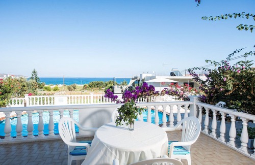 Set amongst a patchwork of green vineyards on the hillside just 500 metres from sandy Stalos (https://www.freelancevillas.com/stalos-villas/) beach, Rouladina Apartment 2 is one of a group of just 6 apartments in a quiet neighbourhood. Since they were first introduced to our program, the Rouladina Apartments have proved consistently popular and guests return year after year. They come back, not only for the location and comfort of the apartments, but for the warm welcome from the owners, Manolis and Dimitra. They have their own apartment and take care of the property and their guests with a perfect combination of discrete Canadian/Greek efficiency and genuine Cretan hospitality.Location StalosJust a short stroll downhill from the apartments there is a choice of several tavernas, shops and mini markets. Opposite the apartments is a family run taverna which has been approved by several guests as well. The long sandy beach of Stalos runs for 7kms merging with Agia Marina and Platanias, which are more bustling in peak season vs the low key Stalos beach. There is a regular bus service to Chania (https://www.freelancevillas.com/chania-villas/) on the main road in Stalos. Shared facilities, Rouladina ApartmentsShared Swimming Pool - 10m x 5m swimming pool. Depth 1.1m - 2m.Sun Terrace - furnished with sunbeds and parasolsReception area - with shower, WC, washing machine, library and luggage storage (for arrival/departure day). Outside Rouladina Apartment 2 - pool side, ground floor apartment.Private terrace overlooking pool - furnished with table and chairs and comfy rattan chairs. A gate is there to keep children safe.Inside Rouladina Apartment 2Open plan living room Sitting area - Sofa and chairs, Local TV.Dining Area - wooden dining table and chairs. Window with pool and sea view. Door to poolside terrace. Air con unit.Kitchen area - worktop over wood cupboards ceramic hob and electric oven, double sink, large fridge freezer.Double bedroom with en suite shower room - 1 Double bed, wardrobe and ceiling fan. Window with pool and sea view. Shower room, with walk-in shower, wash hand basin and WC.Twin Bedroom - 2 single beds (can be placed together), door opening to rear terrace, wardrobe and ceiling fan. Patio doors to bougainvillea covered rear terrace.Twin bedroom - 2 single beds (can be placed together), wardrobe and ceiling fan. Windows with view of the rear terrace.Family bathroom - bath with shower attachment, wash basin, WC.HousekeepingYour apartment will be prepared for you on arrival with fresh bath and hand towels and all beds made up. For stays of 7 nights or more - house towels will be changed every 3 - 4 days. For stays of 14 nights or more - bed linen will be changed every 7 days. Pool/beach towels - one per person for the duration of your stay.ParkingOn site there is parking for four cars plus ample off road parking.