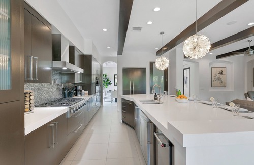 Welcome to Royale, a one-of-a-kind desert sanctuary with 8 bedrooms, 6.5 bathrooms, and 4,500+ sq ft of indoor luxury. Set against sweeping mountain views, Royale blends privacy, comfort, and style with resort-level amenities designed for unforgettable gatherings. Step inside to soaring wood-beam ceilings, polished tile floors, and modern desert-chic design. The open living area flows into a chef's dream kitchen with white marble counters, pro-grade appliances (6-burner range, double oven, pot filler), plus every gadget from coffee grinders to waffle makers.