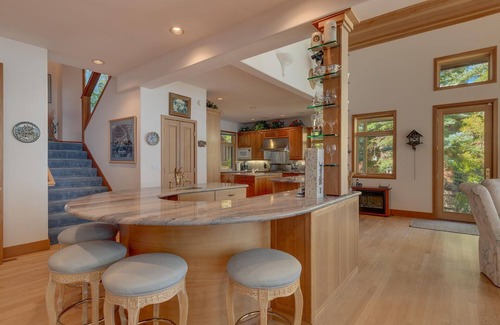 Enter directly into the main living area of this exceptional 4-bedroom Lake Tahoe vacation rental, where floor-to-ceiling windows offer big lake views, and allow sunlight to fill the room. The kitchen is fully equipped, including a Wolf range and a separate island bar is the perfect place for happy hour. In the great room, a wood fireplace adds to the traditional feel of the home. Two guest bedrooms, sharing a Jack and Jill bath, are conveniently located on the main floor for those who may need to limit repeated use of stairs.