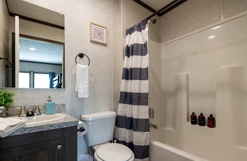 The three bedrooms are down the hallway from the living room. The first bedroom features a king bed and large SmartTV. The second bedroom has a queen bed. The third bedroom features two twin over full bunk beds and has an en suite bathroom! The other full bathroom is also down the hallway, it features a shower and tub combination.