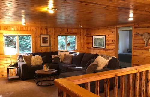 Our cabin has a fantastic deck view of Mt. Sawtelle with a fire pit 🔥 in the back! It is only a few miles off the main highway.